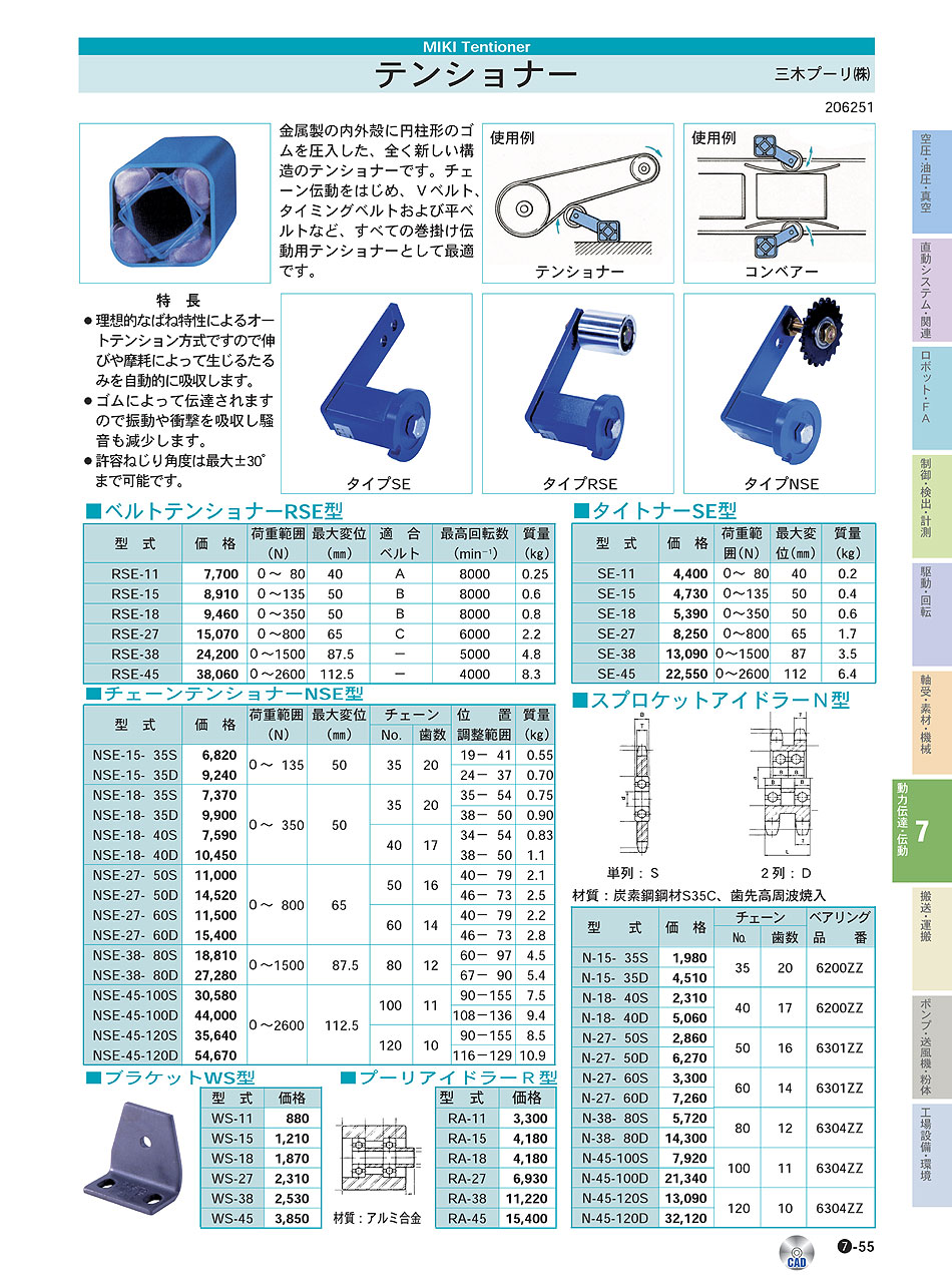 - "三木プーリ(株) ベルトテンショナー チェーンテンショナー スプロケットアイドラー タイトナー P07-055 価格 MIKI Tentioner 三木プーリ株式会社 テンショナー プーリアイドラー ベルトテンショナー N NSE RA RSE SE WS テンションタイトナー RSE型 RSE-11 RSE-15 RSE-18 RSE-27 RSE-38 RSE-45 タイトナーSE型 SE-11 SE-15 SE-18 SE-27 SE-38 SE-45 NSE型 NSE-15-35S NSE-15-35D NSE-18-35S NSE-18-35D NSE-18-40S NSE-18-40D NSE-27-50S NSE-27-50D NSE-27-60S NSE-27-60D NSE-38-80S NSE-38-80D NSE-45-100S NSE-45-100D NSE-45-120S NSE-45-120D N-15-35S N-15-35D N-18-40S N-18-40D N-27-50S N-27-50D N-27-60S N-27-60D N-38-80S N-38-80D N-45-100S N-45-100D N-45-120S N-45-120D ブラケットWS型 R型 WS-11 WS-15 WS-18 WS-27 WS-38 WS-45 RA-11 RA-15 RA-18 RA-27 RA-38 RA-45 スプロケットアイドラーN型 テンショナー コンベアー タイプSE タイプRSE タイプNSE"